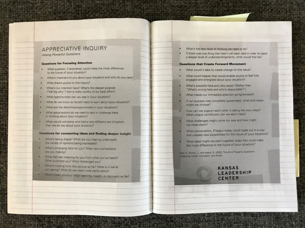 My friends at the The Kansas Leadership Center consider these questions as tools for Appreciative Inquiry, as you can see on the handout in my notebook.