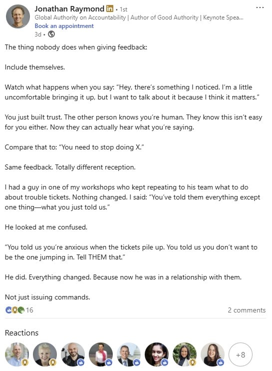 I found this LinkedIn post by Jonathan Raymond encouraging. He’s the author of the book Good Authority: How to Become the Leader Your Team Is Waiting For, which I highly recommend.