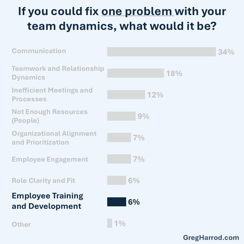 “Employee Training and Development” surfaced in the final set of answers to the question, “If you could fix one problem with your team dynamics, what would it be?” on the 2025 Wichita Industrial Trade Show Leadership Pulse Survey.