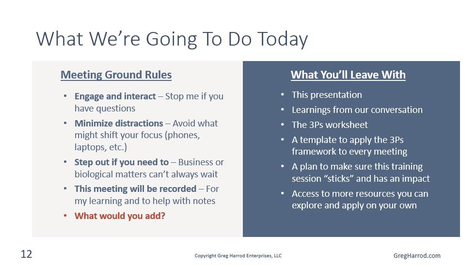 The question, “What would you add?” engages the meeting participants so they have the opportunity to participate in adjusting the ground rules before the meeting even starts.