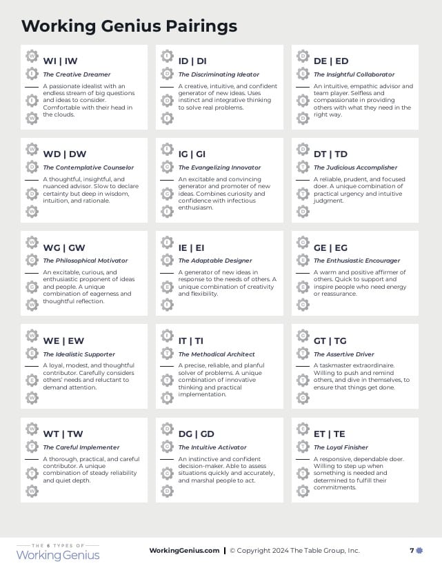 I find this summary of the Working Genius Pairings super helpful, and I print a copy to have handy for reference.